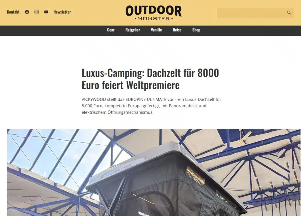 VICKYWOOD stellt das EUROPINE ULTIMATE vor – ein Luxus-Dachzelt für 8.000 Euro, komplett in Europa gefertigt, mit Panoramablick und elektrischem Öffnungsmechanismus.